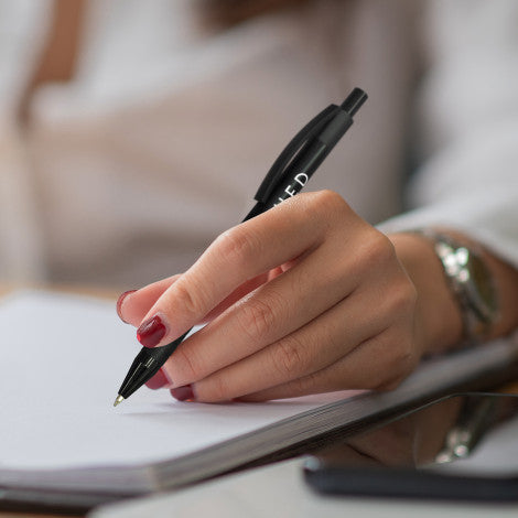 Retractable aluminium ballpoint pen with a matte black anodised barrel with a textured grip, a black clip and a shiny chrome accent. It has a black large volume refill with 1200 metres of German manufactured Dokumental ink. The Obsidian Pen can be presented in an optional pen sleeve or a gift box.